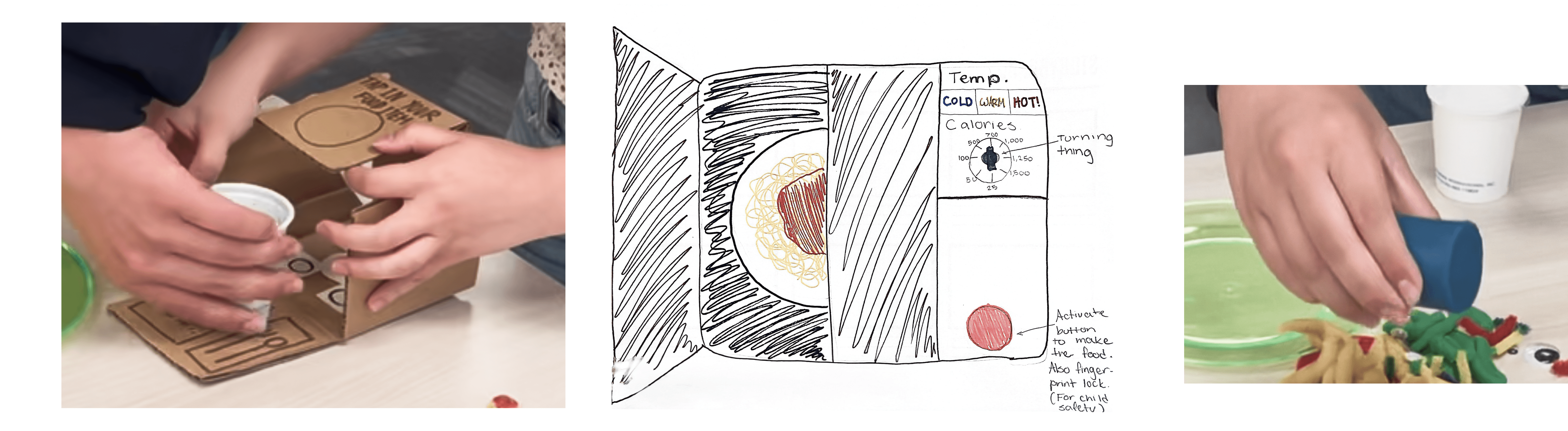 Teens welcomed convenience. They imagined machines that could generate meals in seconds, respond to cravings, or make food in busy moments. They designed future portable food machines that allow them to access snacks whenever they wanted (left), microwave-like machines that generates food with customizable calories and temperature (middle), and machines that can make imaginary food real, such as "moon-bean ice cream" (right).