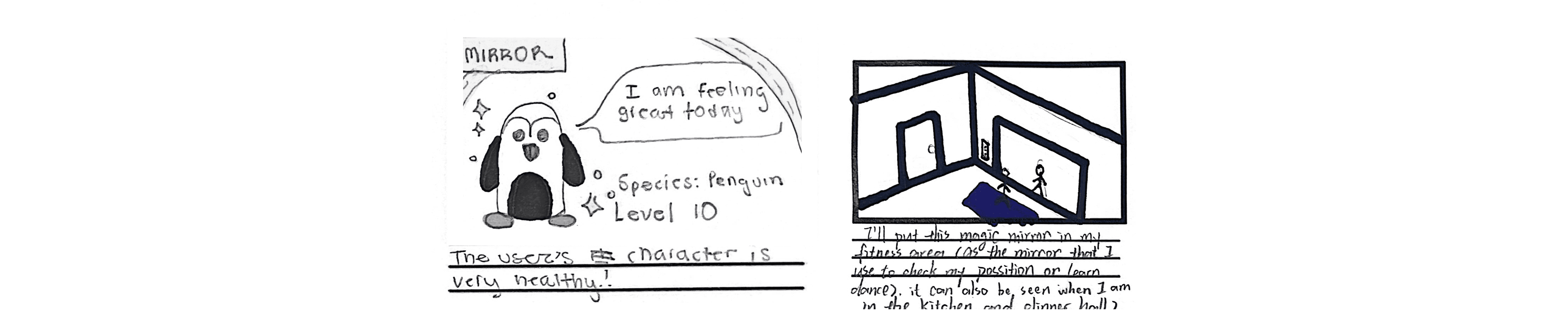 Some wanted reflective technologies that could be turned off, hidden, softened, or only appear at specific moments. Reflection, for them, was not something that should happen constantly. It had to be bounded, timed, and emotionally safe. For example, a penguin character instead of herself allowed Amy to keep a more comfortable distance from her health data reflection (left); a reflective mirror places in the dedicated exercise area in her home allowed Kathy to access her health data only when she finds it helpful.